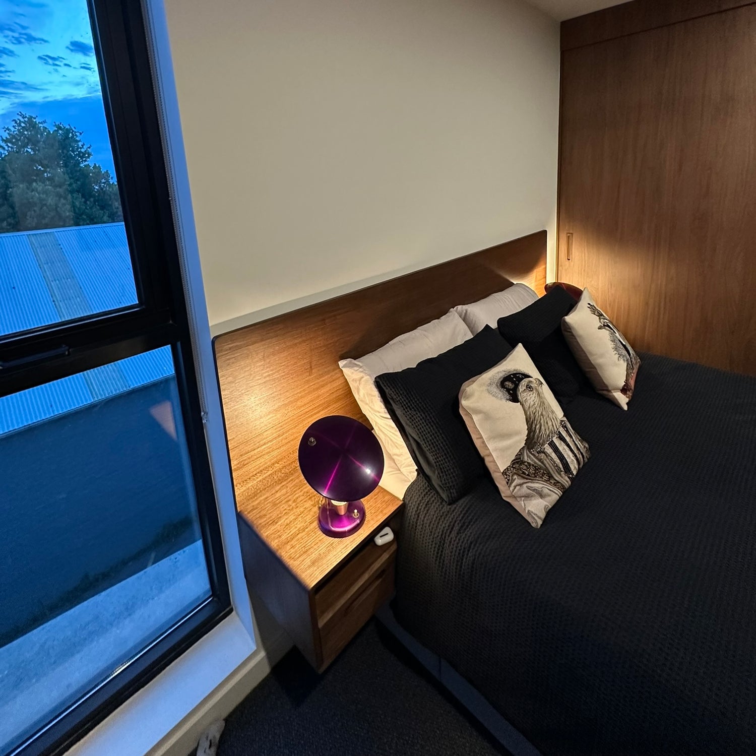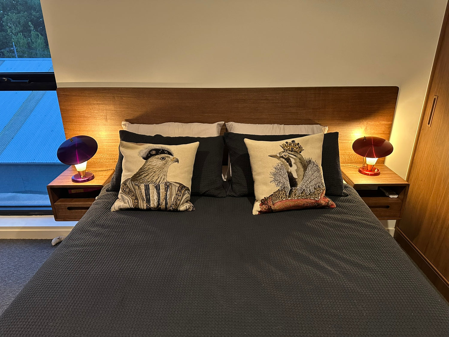 Dimensioned perfectly for a bed of generous height and limited wall space, the headboard nestles next to existing American walnut finished built in robes in a complementary but distinctly Australian shade.