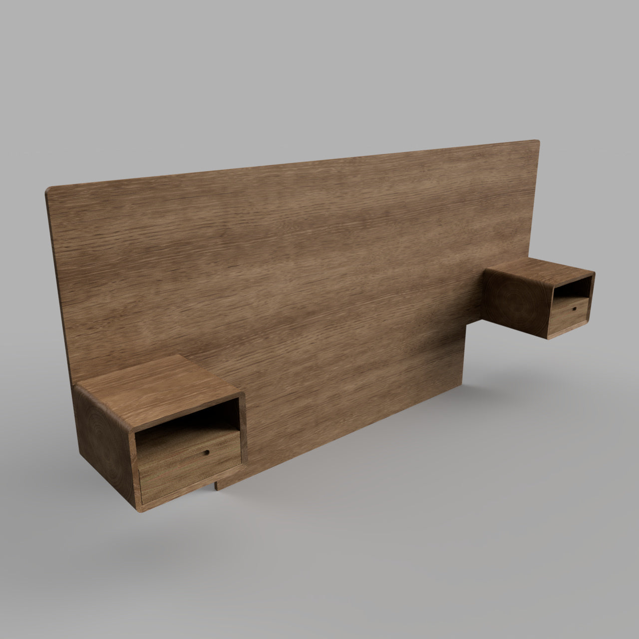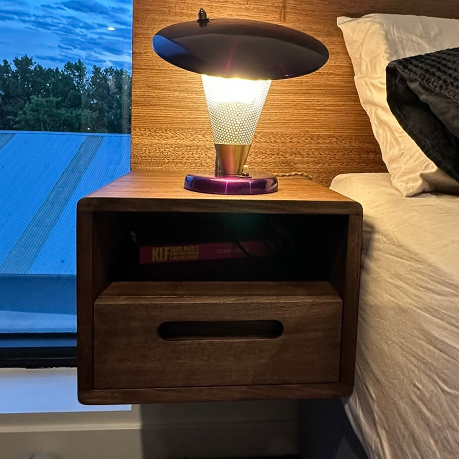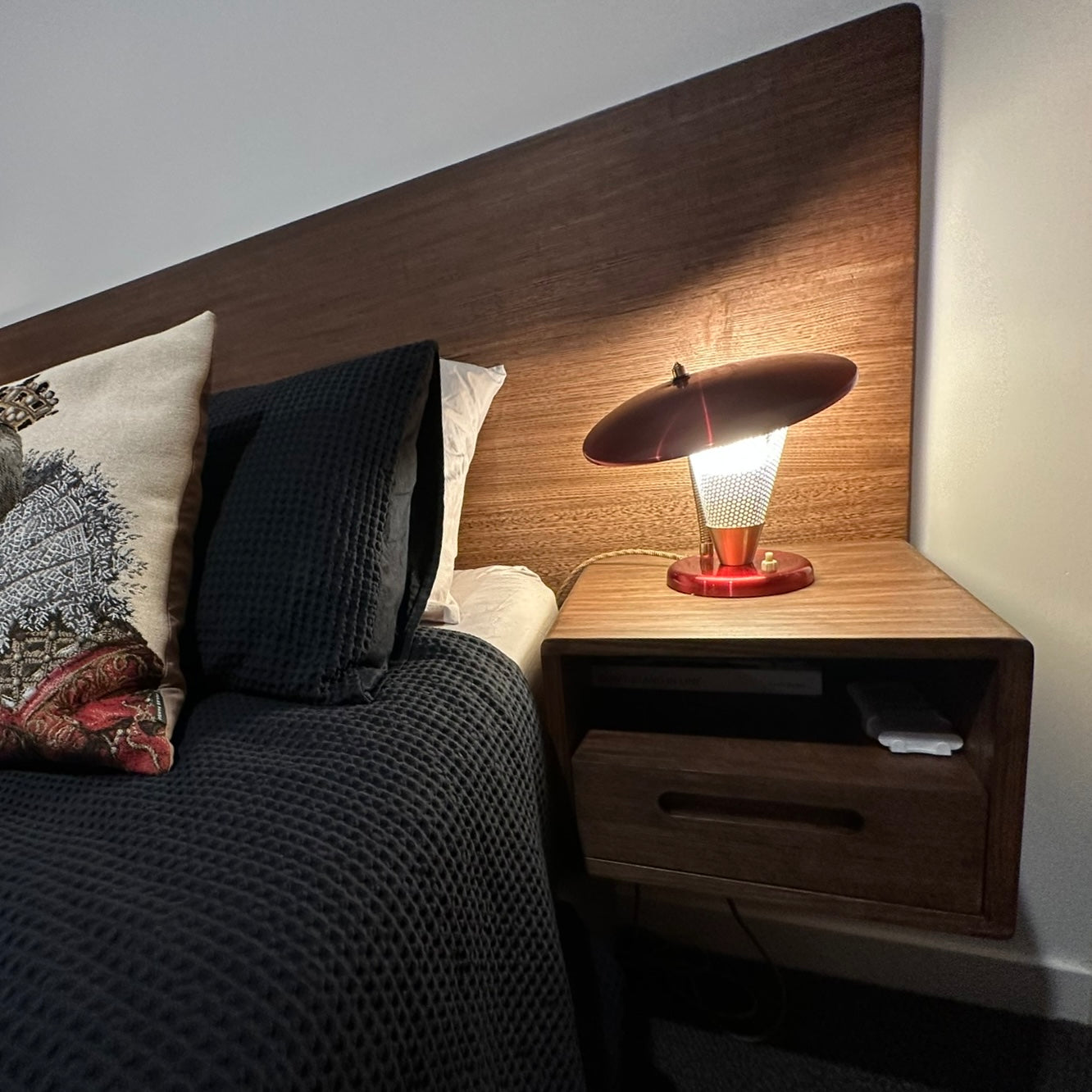 Side tables are secured from behind while the bedhead itself is fixed flush to the wall and rests on the skirting behind, enabling a seamless floating appearance.