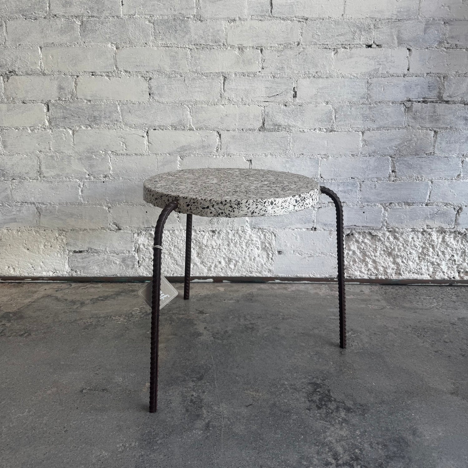 The concrete top is created from at least 50% recycled marble which are ground and polished for a subtle terrazzo effect. Legs are moulded reinforcing bar which is lightly rusted, treated and sealed, making for a complementary material that is not shy about showcasing its industrial roots.